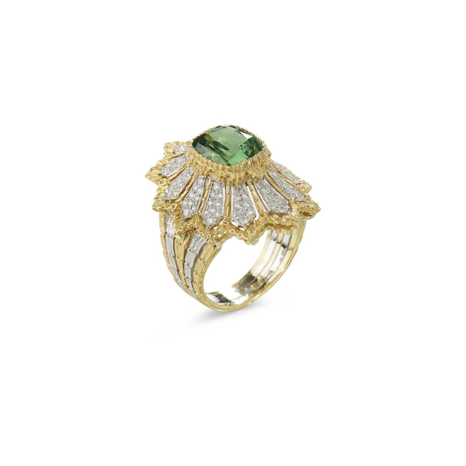 Cocktail pagoda ring with white gold and diamond spiculated headpiece intertwined with molded yellow gold threads. In the center, a yellow gold cushion bezel set with tzavorite, surrounded by yellow gold rose molded ruffles. Yellow gold notched edges and yellow gold rigato band with white gold inlay. 1 faceted tzavorites 3.11 carats and 108 round brilliant cut diamonds 0.43 carats.
