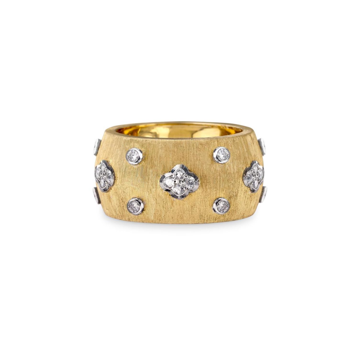 The rigato effect, obtained by handmade engraving, reaches its peak of virtuosity in the Macri Collection. The surface is wavy and embellished with brilliant-cut diamonds set in tiny star-shaped rosettes. Small and shiny gold beads play with the opaque texture and the light of the diamonds.