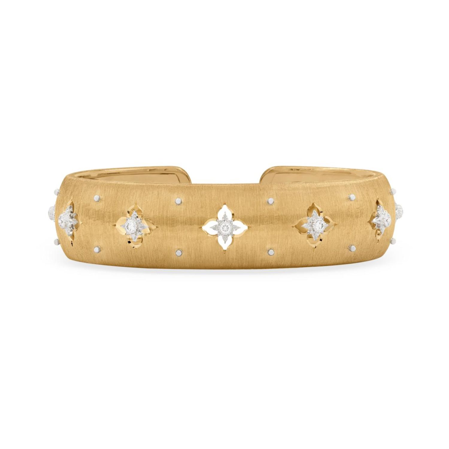 The rigato effect, obtained by handmade engraving, reaches its peak of virtuosity in the Macri Collection. The surface is wavy and embellished with brilliant-cut diamonds set in tiny star-shaped rosettes. Small and shiny gold beads play with the opaque texture and the light of the diamonds.