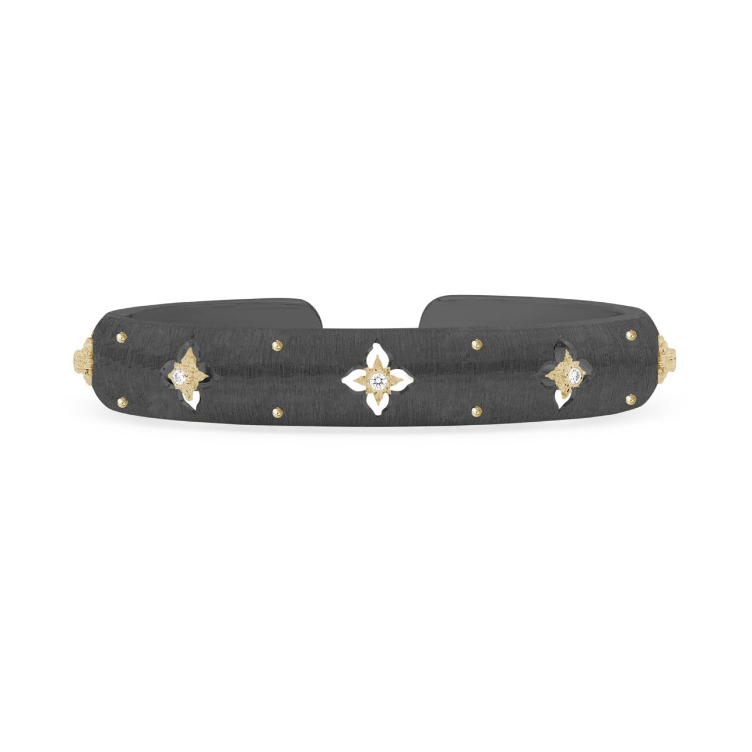 The rigato effect, obtained by handmade engraving, reaches its peak of virtuosity in the Macri Collection. The surface is wavy and embellished with brilliant-cut diamonds set in tiny star-shaped rosettes. Small and shiny gold beads play with the opaque texture and the light of the diamonds.