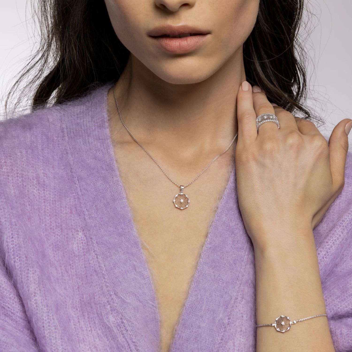 Also called the ‘tulle’ technique, this workmanship is one of the most complex in High Jewelry. It takes nearly a month for the Goldsmith to create a gold plate of half a millimeter by hand and shape minuscule hexagonal cells inside of it. The design comes to light and levitates upon the impalpable honeycomb texture.
