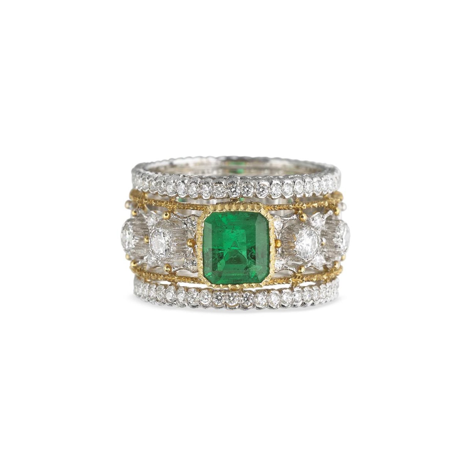Band ring in white gold with upper part outlined with diamonds alternating with leaf-shaped white gold bezels. In the center, octagonal yellow gold bezel molded in leaflike design with an emerald. The lower part engraved in "rigato" and "ornato" with central stars. Edges in white gold and diamonds, with leaf designs chasing each other. 66 round brilliant diamonds 0.5 carats, 4 round brilliant diamonds 0.4 carats and 1 emerald 1.2 carats