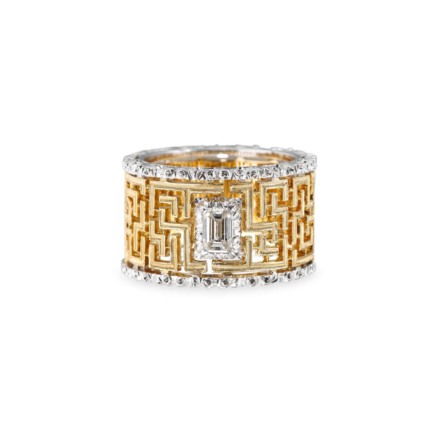 Band ring in yellow gold with upper part drawn into a labyrinth. On the back, engraved in "rigato" and "ornato", with small roses. Octagonal bezel in white gold molded into a leaf with emerald cut diamond. Leaf shaped white gold edge. 1 Diamond 0.4 carats.