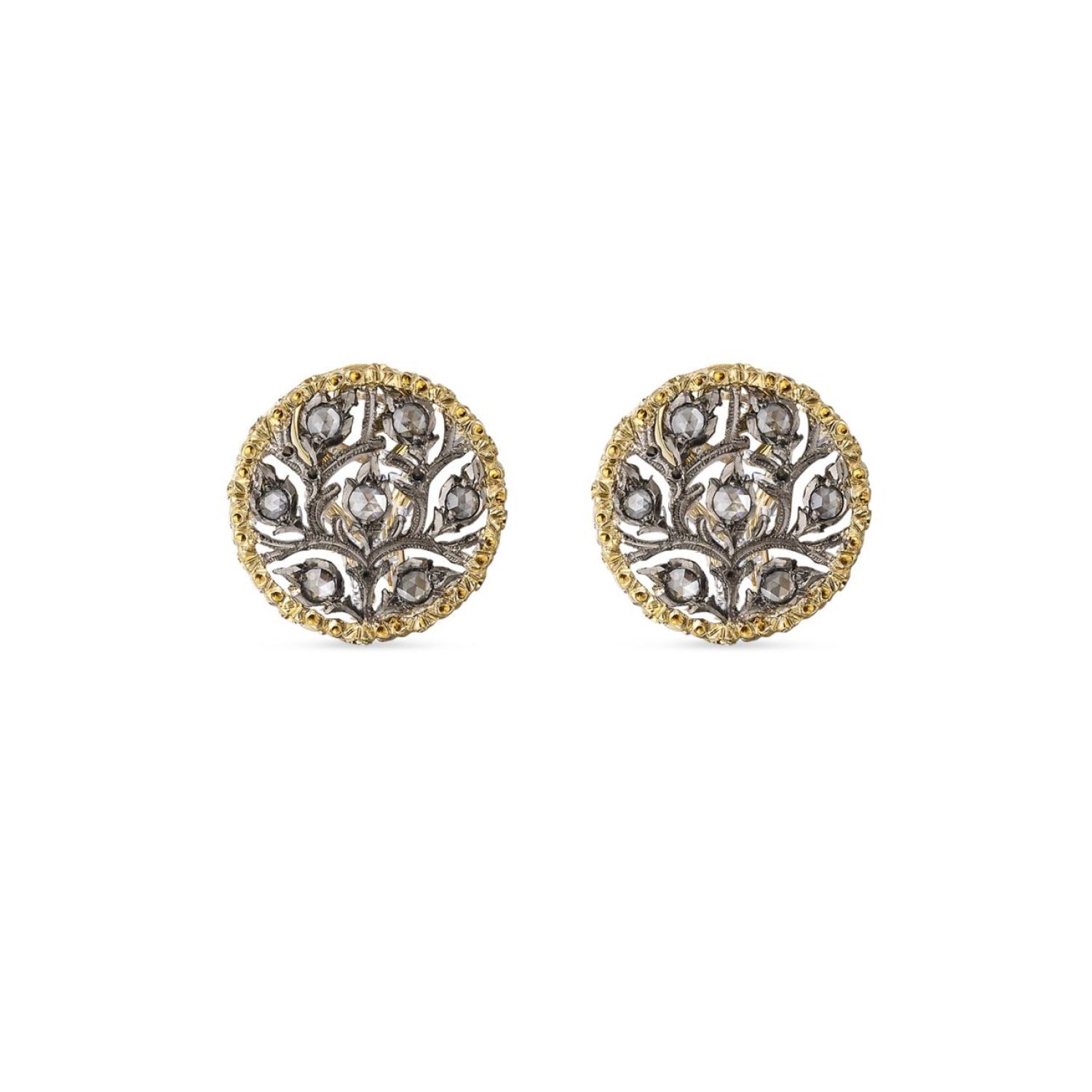 Button Earrings in openwork white gold set with diamonds, with leaf-modeled yellow gold borders. Burnished finishing