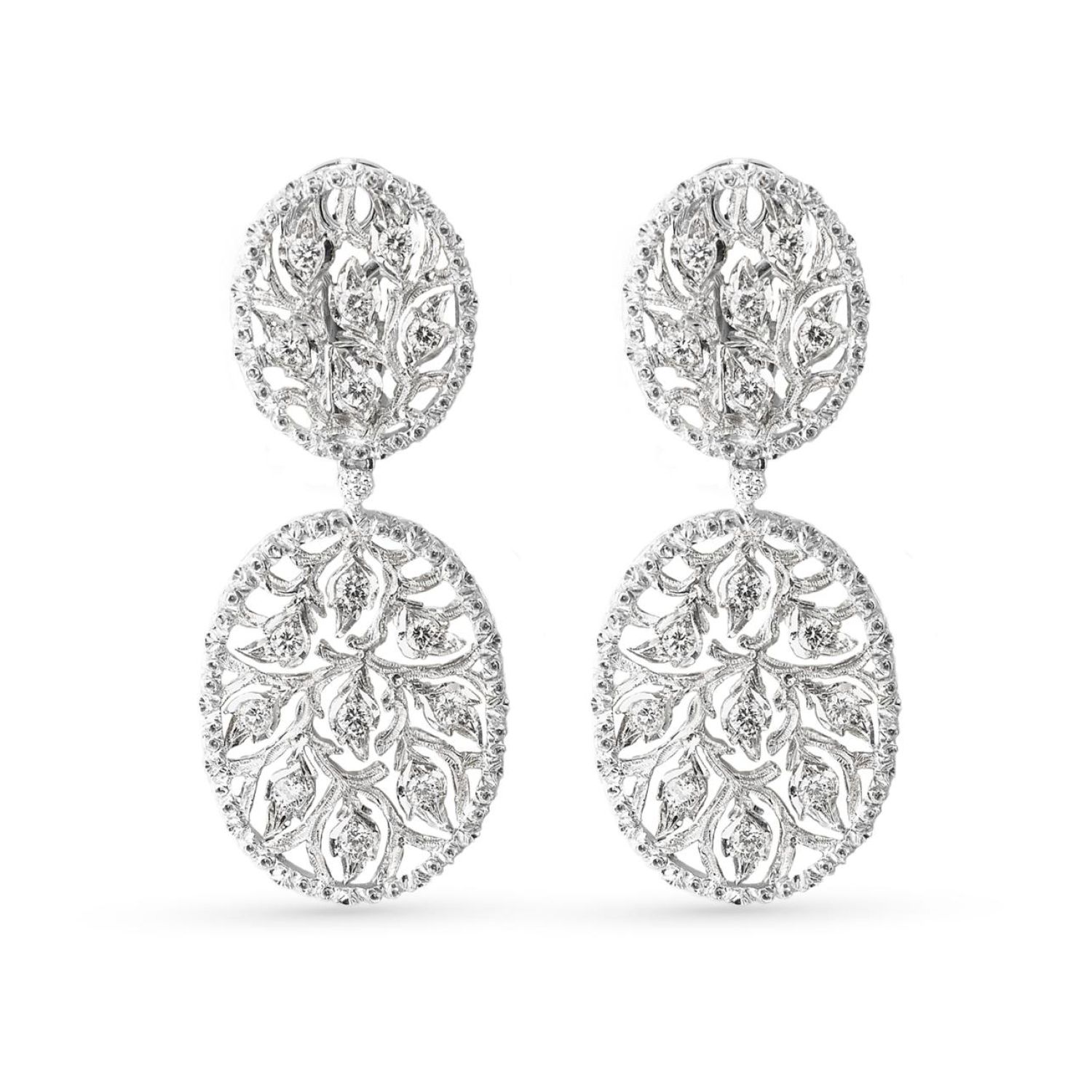 Oval Pendant Earrings in openwork white gold set with diamonds, with leaf-modeled white gold borders
